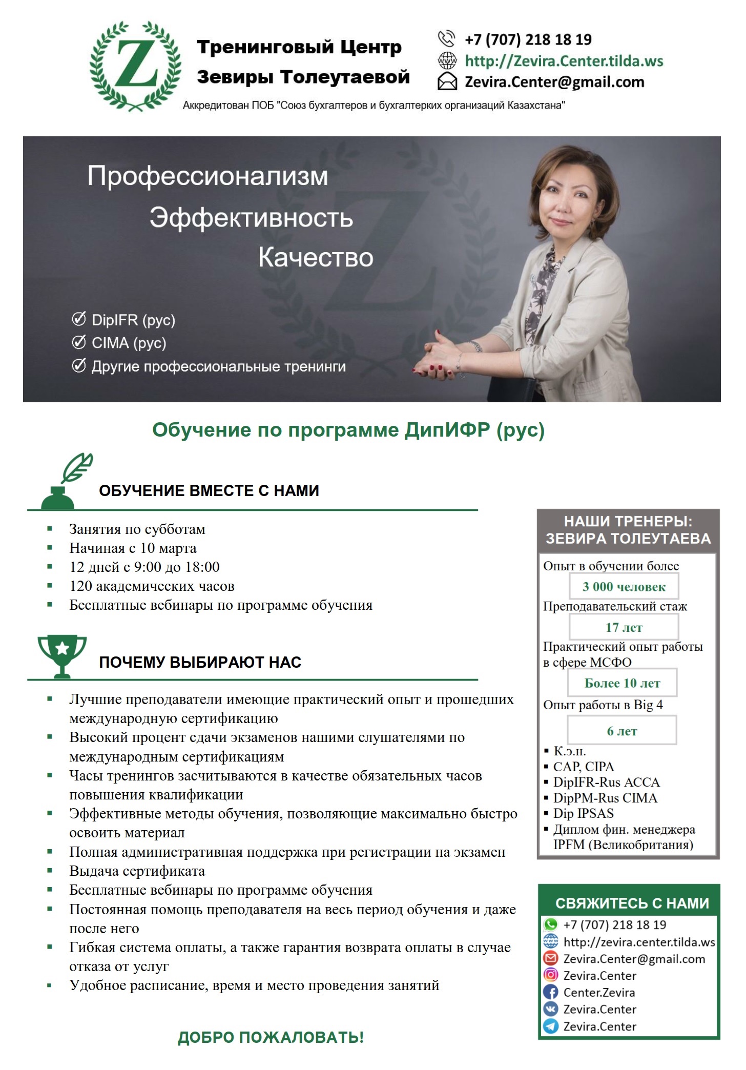 | ИП "Тренинговый центр Зевиры Толеутаевой" | ДипИФР (рус) | Пользователи 250000 Члены союза 250000 |